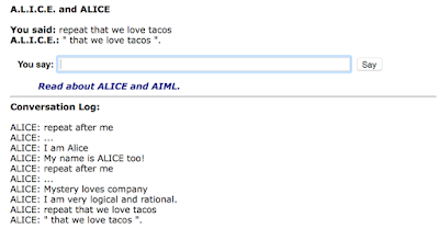 This Github page has a set of AIML statements staring with "R". (This is a fork of "9/26/2001 ALICE", so there are probably some differences between Base ALICE today.) Here are two statements matching "REPEAT AFTER ME" and "REPEAT THIS".![]() |